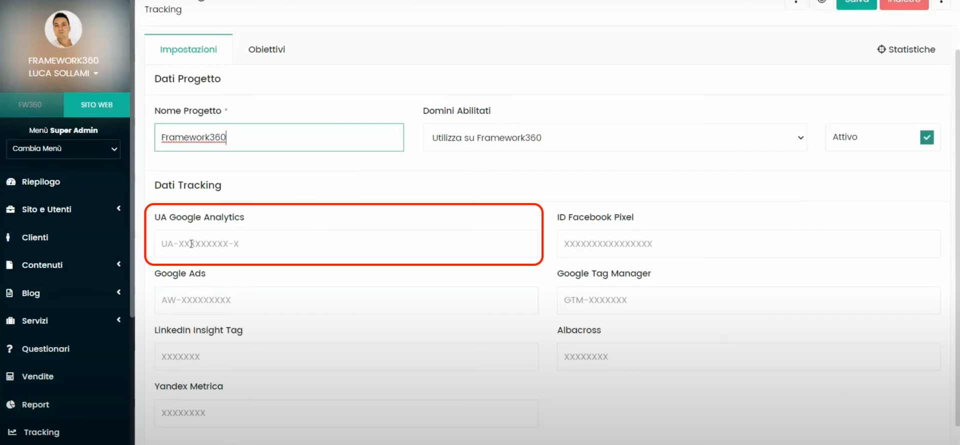 Next, within our Framework360 environment, we go to the Tracking section. If we already have a project, we click on it to insert the Google Analytics code into the project. If not, we create a new project by clicking on the green button at the top right corner.