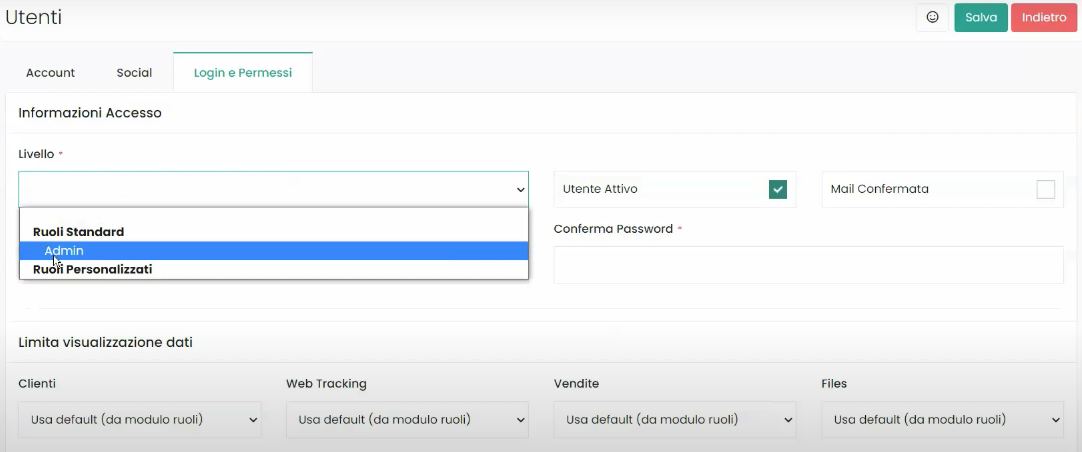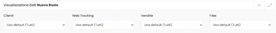 In the section Data Display New User, on the other hand, we might decide whether the user will be able to see all data related to Clients, Web Tracking, Sales, and Files, or if they can only view their own data pertaining to the aforementioned categories.