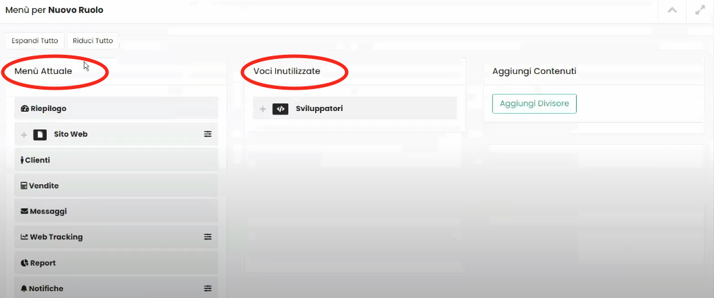 To modify the Sidebar, we will move to the column Current Menu in the section Menu for New Role the items that we want our user to see, while we will move to the column Unused Items those items we wish not to display as shown in the figure: