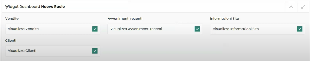 Continuing to scroll down the Permissions page, we will come across the section New Role Dashboard Widget through which we can decide which widgets, present within the dashboard, our user will be able to view.
