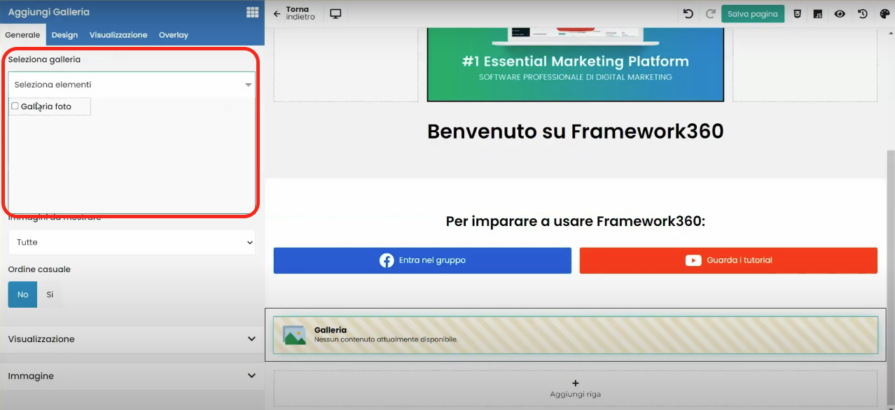 At this point, using the visual builder of Framework360, we proceed to add the Gallery block inside the row and select the gallery that was previously created.