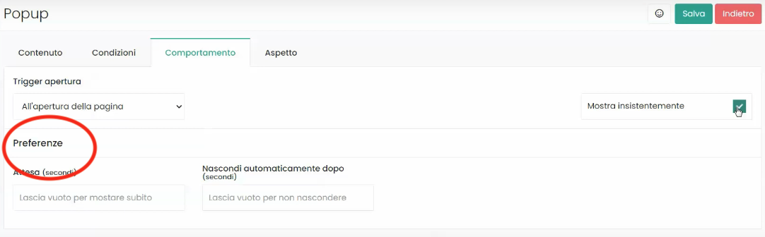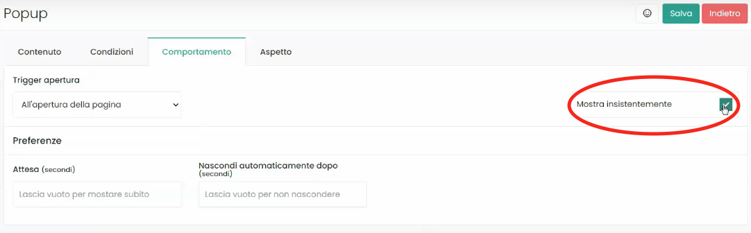 Within the Behavior area we could choose to persistently show the popup through the option Show persistently, meaning, the popup will be shown every time the user changes page.