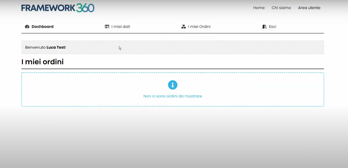 Among the pages created by default by Framework360, we will find a page called User Area, this is the page where the user will find all the information reserved for him. In the next step, we will see how to add the User Area page to our website's menu so that it can be easily reached by our users.