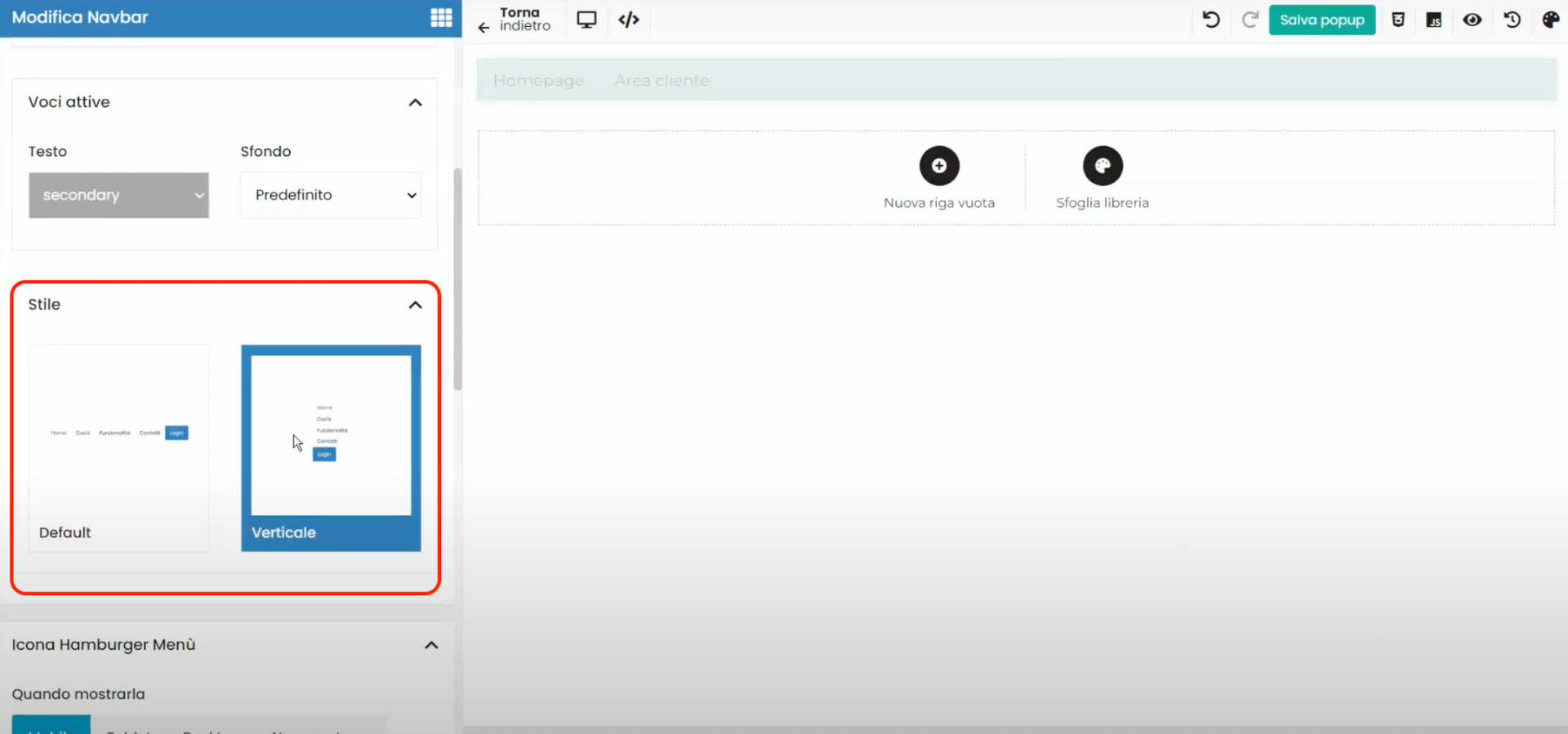 Within the “Typology” entry, we define whether the pop-up should open from left to right or from right to left by selecting the “Offcanvas – Left” or “Offcanvas – Right” option respectively.