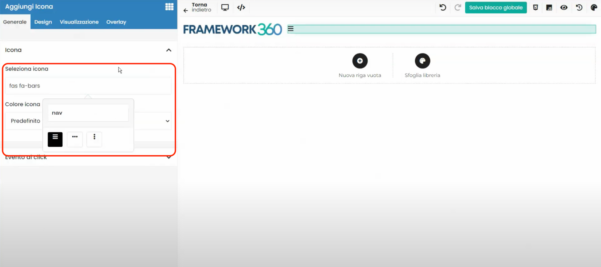 At this point, Framework360 will open the Visual Builder screen for the header modification. Here, we will remove the menu and add the "Icon" block, dragging it into the top right row, as shown in the following figure.