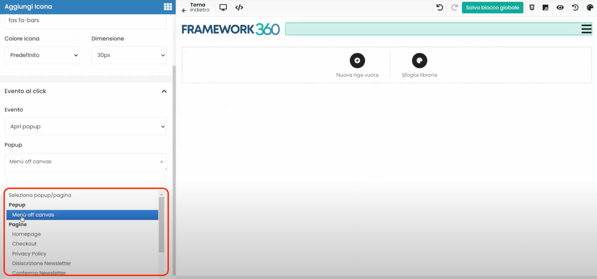 Framework360, once defined as an event on click for opening a pop-up, will ask us which pop-up we want to open. We will select our off-canvas menu that we created in the previous step.