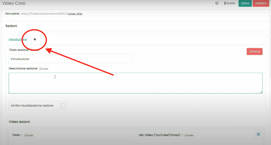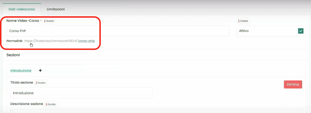 Within the Videocourse tab, first we will give a name to our Videocourse and then, under the heading Sections, we can go on to create the various sections of our videocourse.