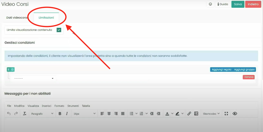 Once our plan is created, we will need to make the video course accessible only to users who have purchased the plan; to do this, we will need to go to the Restriction tab (which we talked about in step 2 of section) Creation of the video course of our video course and activate as a limitation the newly created Membership.