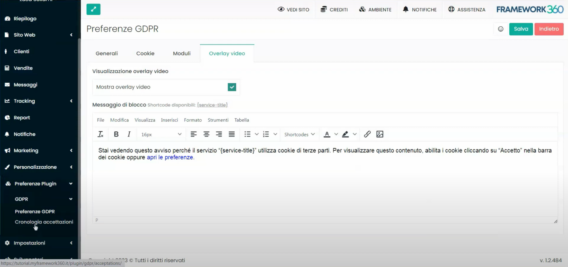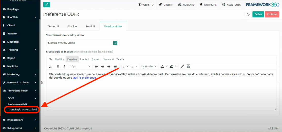 At this point, the "GDPR Preferences" customization skim will open, and the screen will be divided into four tabs: General, Cookies, Forms, and Video Overlay. Let's now see what we can do in each of these tabs.