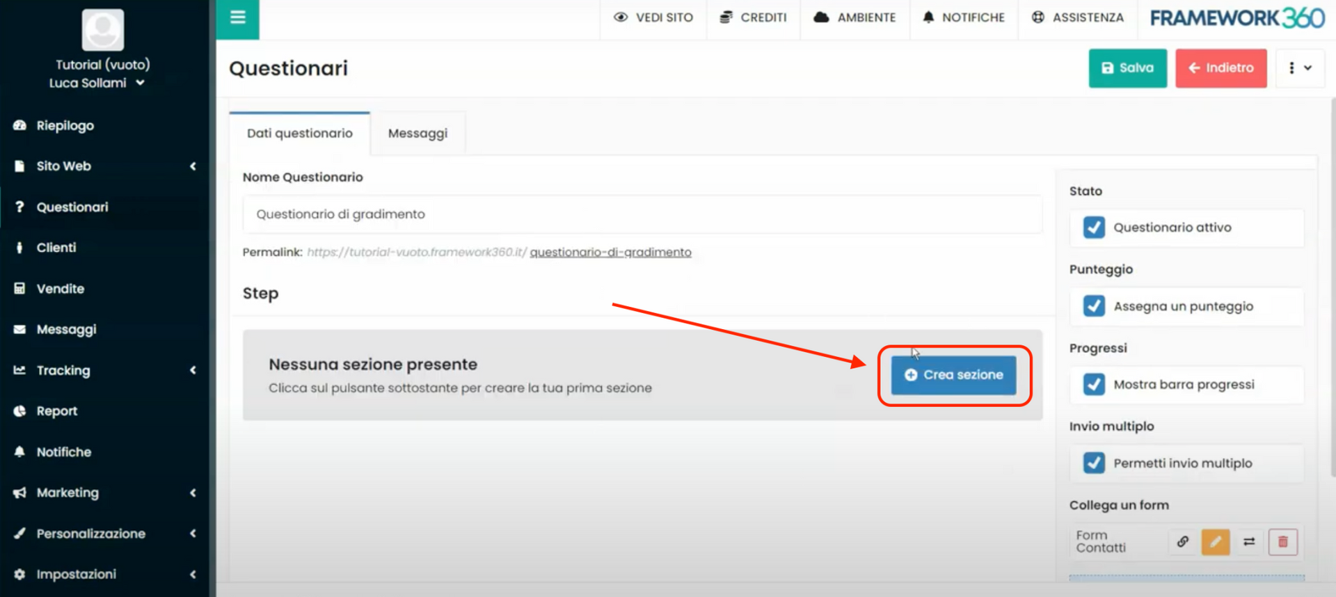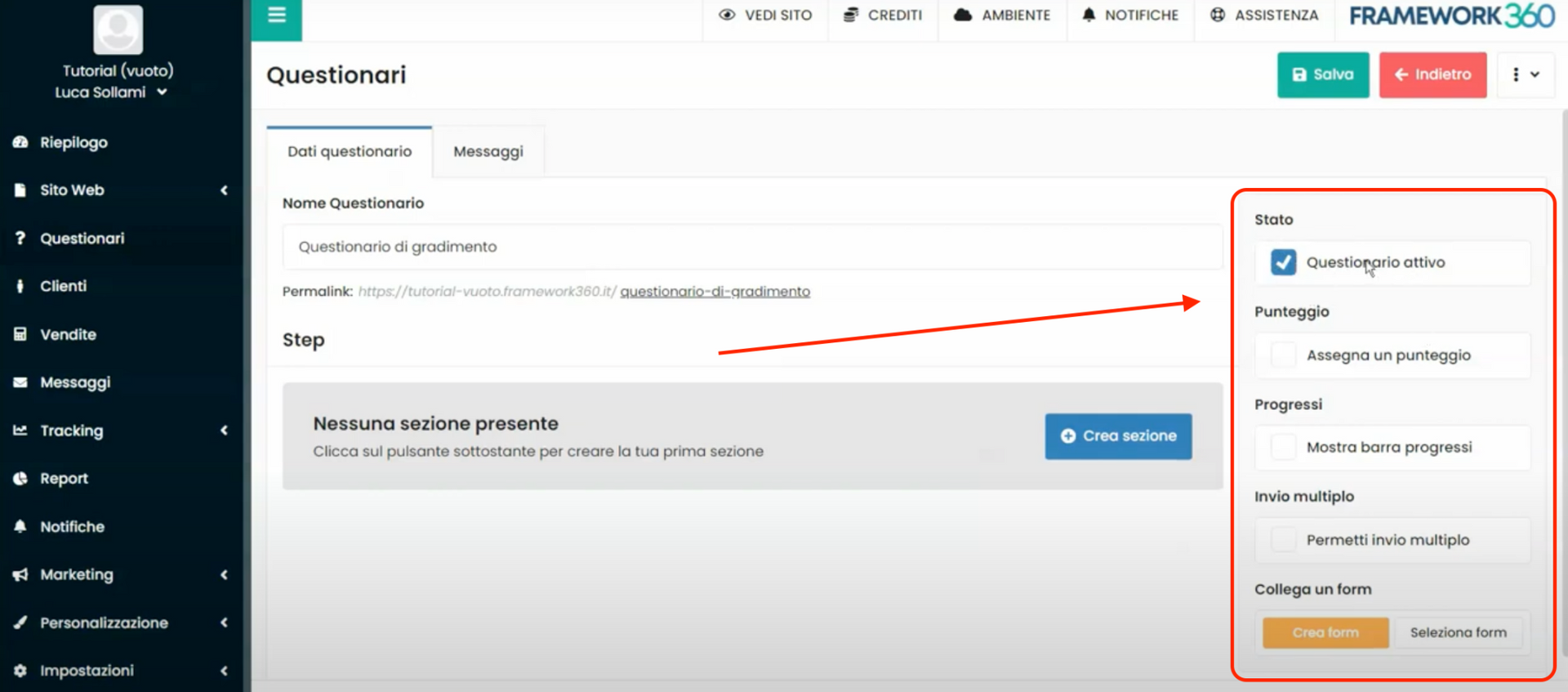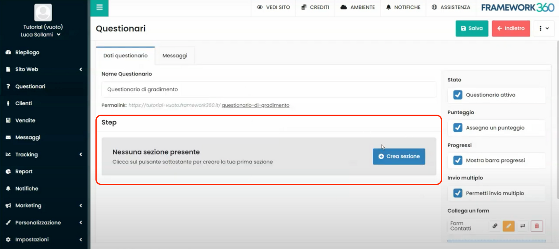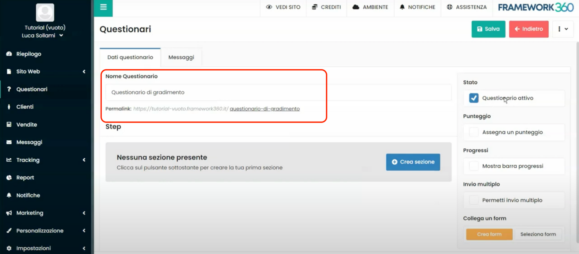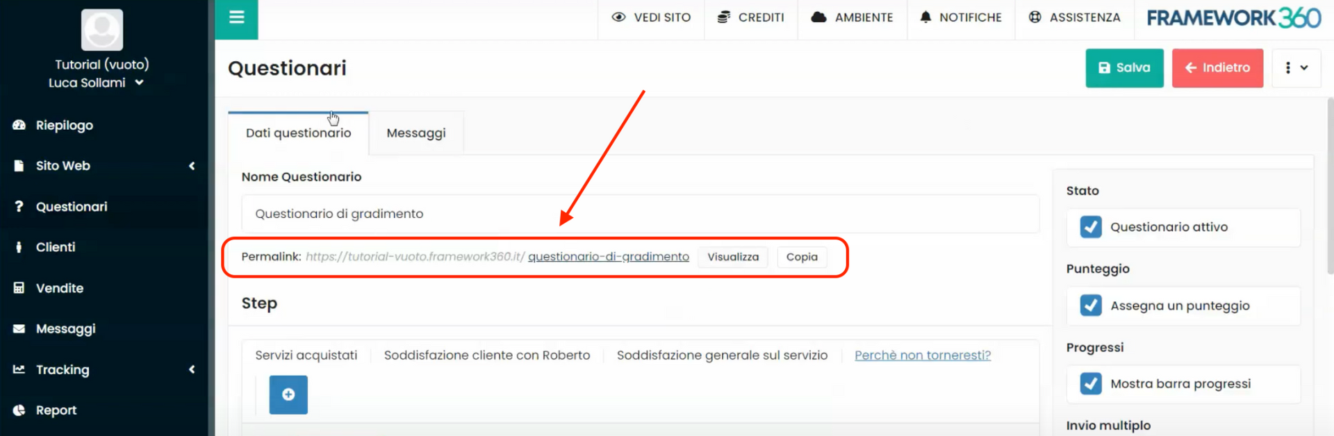 Once the customization of the messages is complete, we can save our questionnaire by clicking on the green button at the top right "Salva" and view it through the permalink located below the questionnaire name, as we saw in step 2.