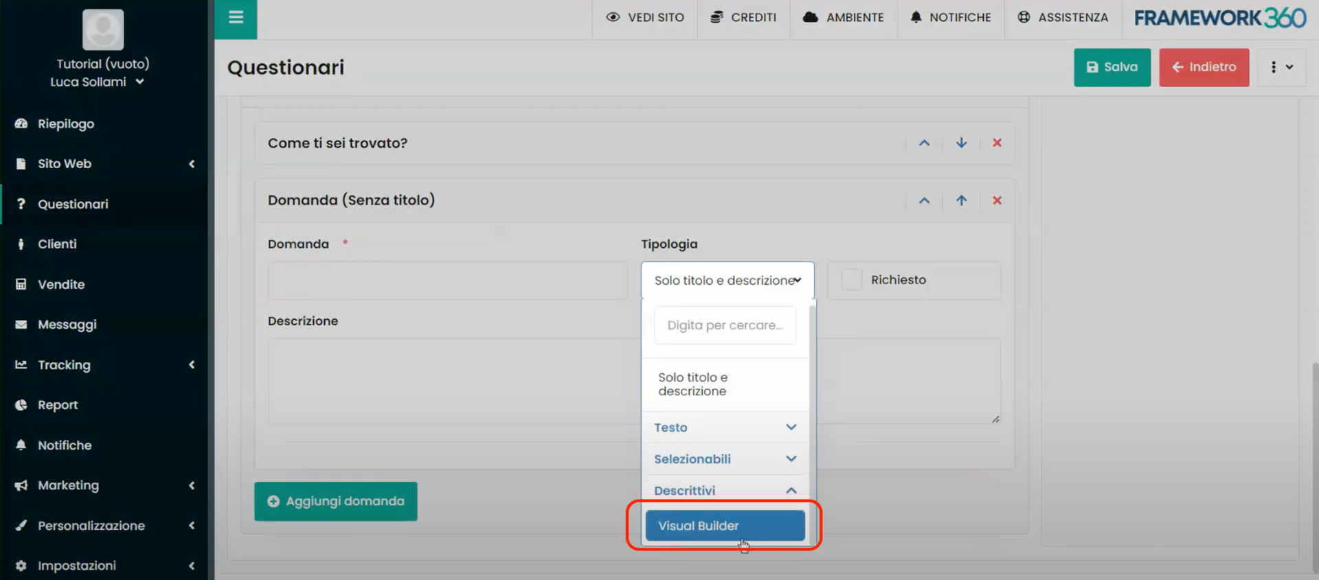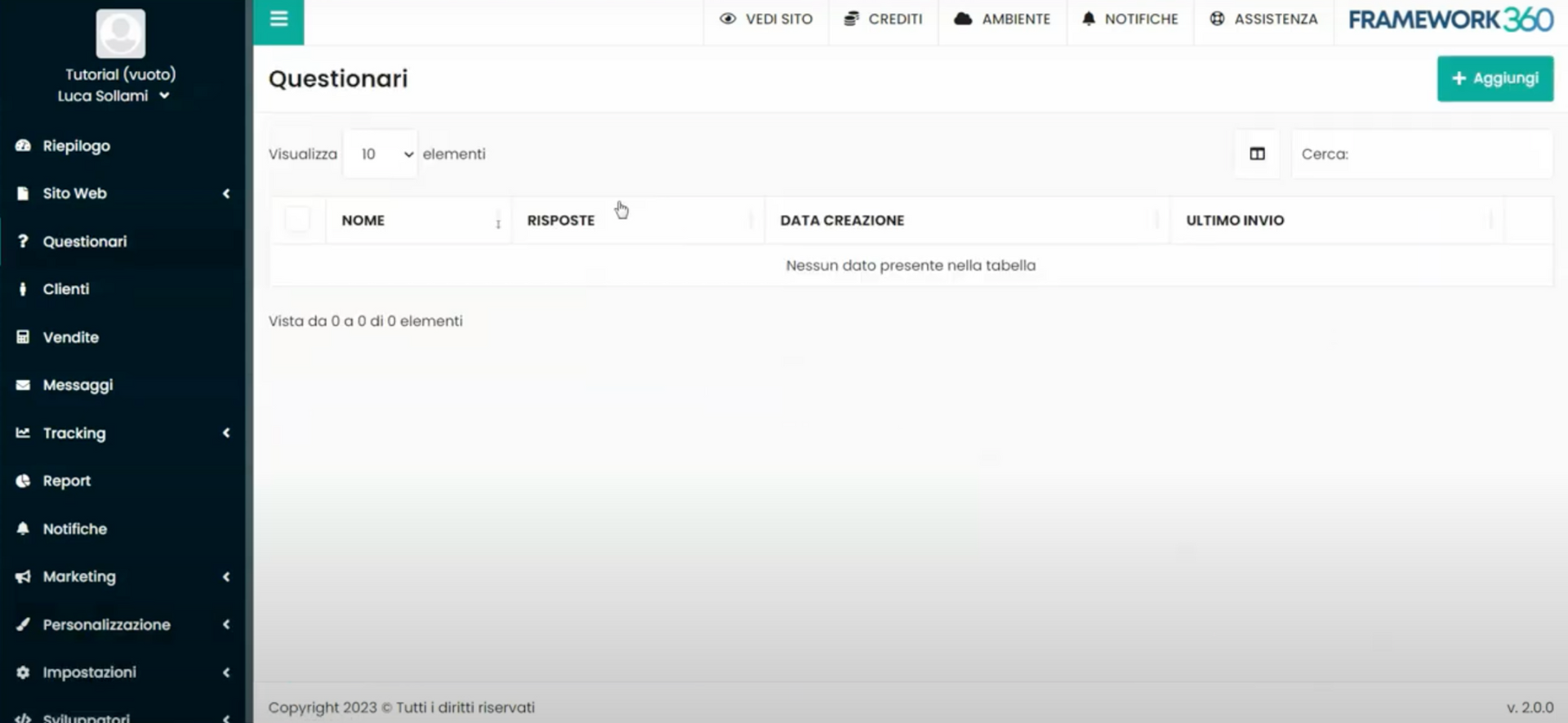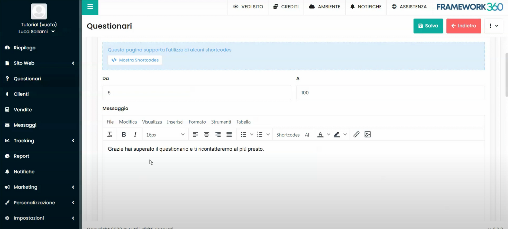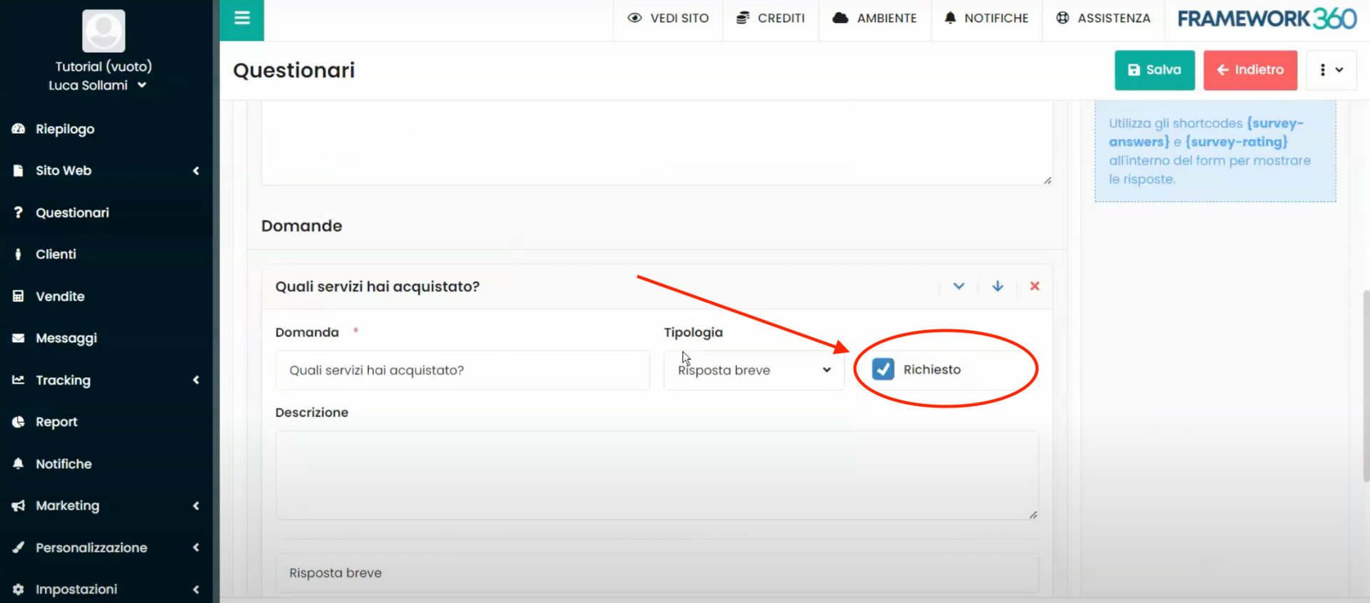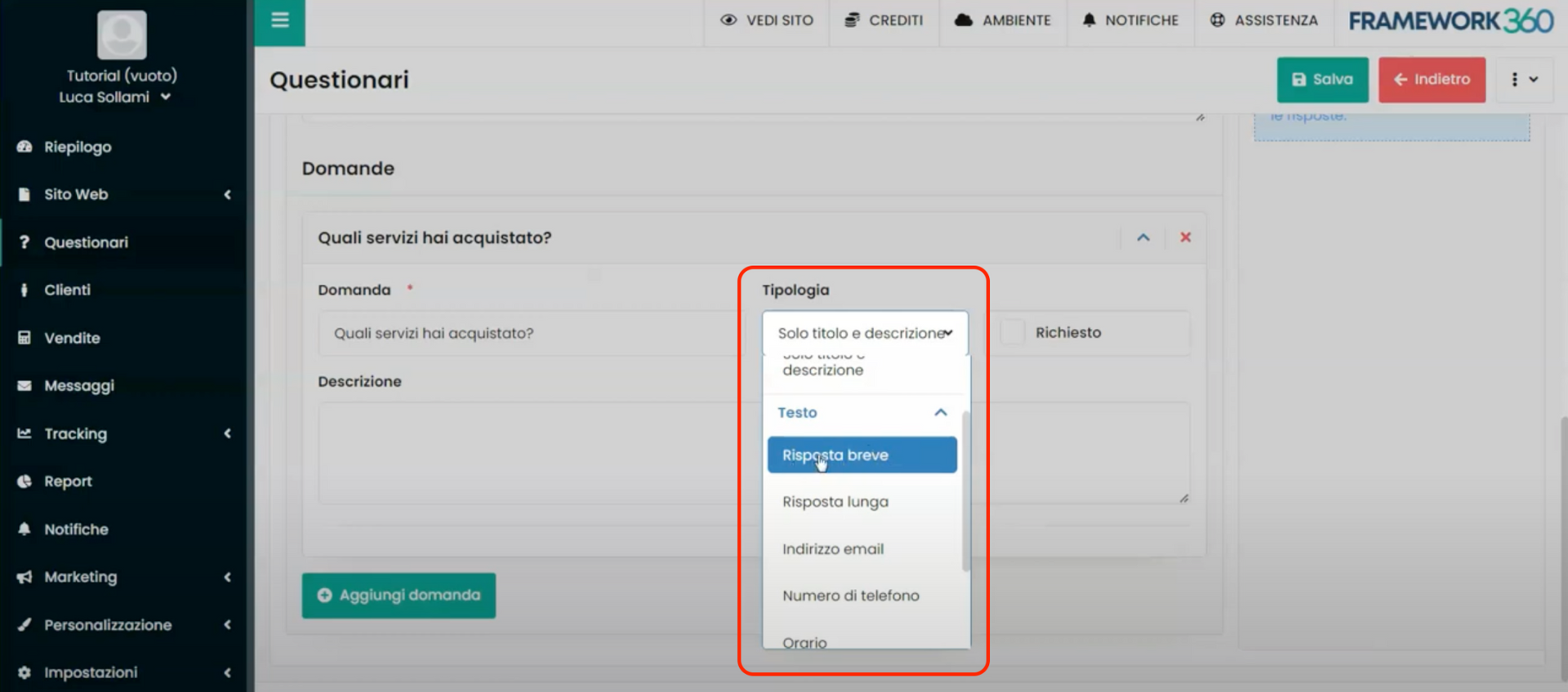 Inside this tutorial we will see how to create a questionnaire or a survey with Framework360, to be sent to our customers to find out, for example, their level of satisfaction during the purchase of our services or products on our website or in the company.