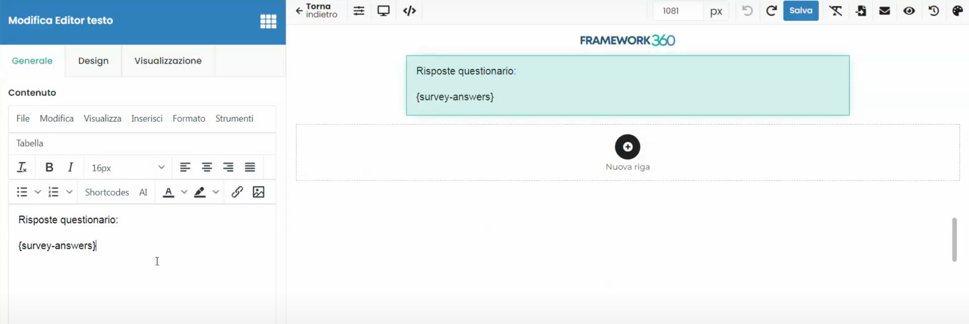 As seen in the third step of this guide, at the end of the questionnaire we can link a form. If we choose to do so, we can include in the body of the email that the system automatically sends after form submission, the shortcodes {survey=answers} and {survey=rating}. These shortcodes will allow displaying the responses and rating of the questionnaire inside the email. The shortcodes I just mentioned are shown on the right side of the "Dati questionario" tab in the questionnaire customization screen.