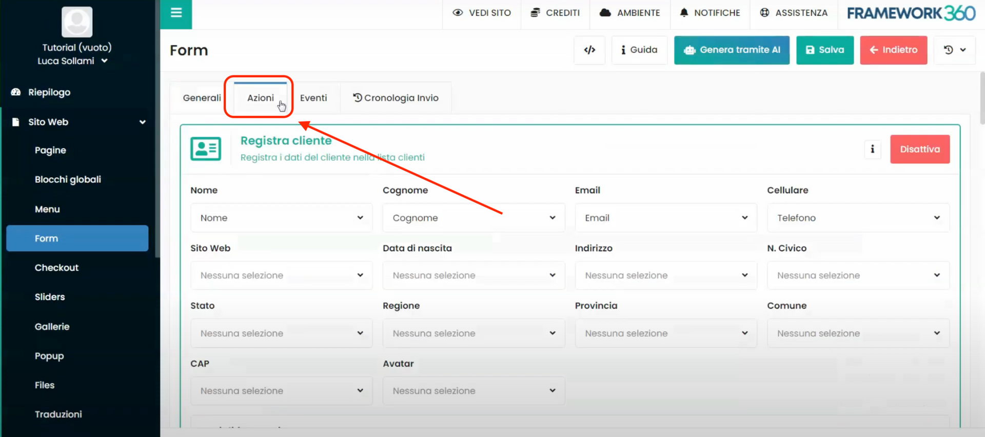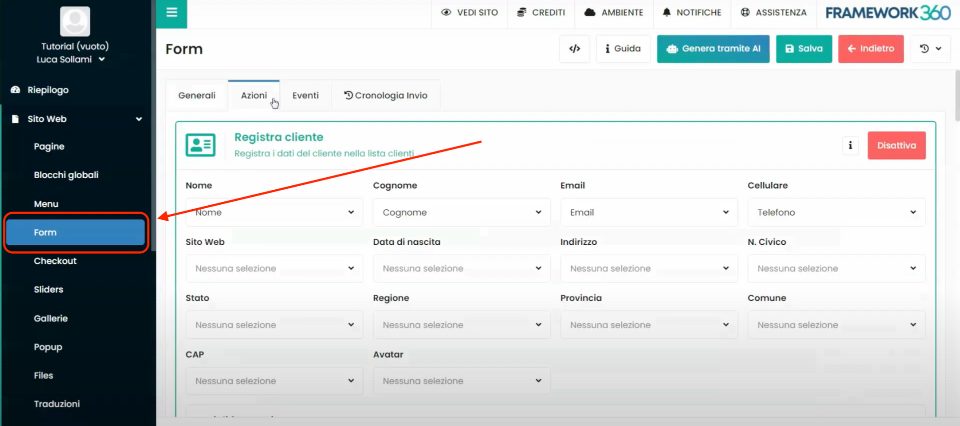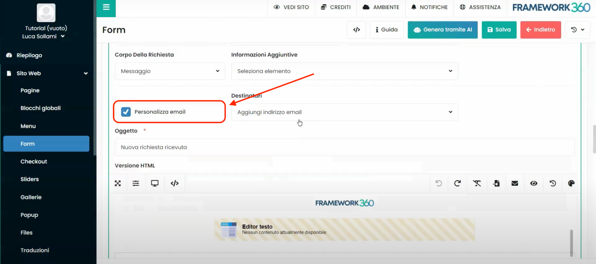 To customize the form email, you need to go to the submenu “Forms” located in the main sidebar of Framework360 under the “Website” section and enter the edit screen of the form linked to the questionnaire.