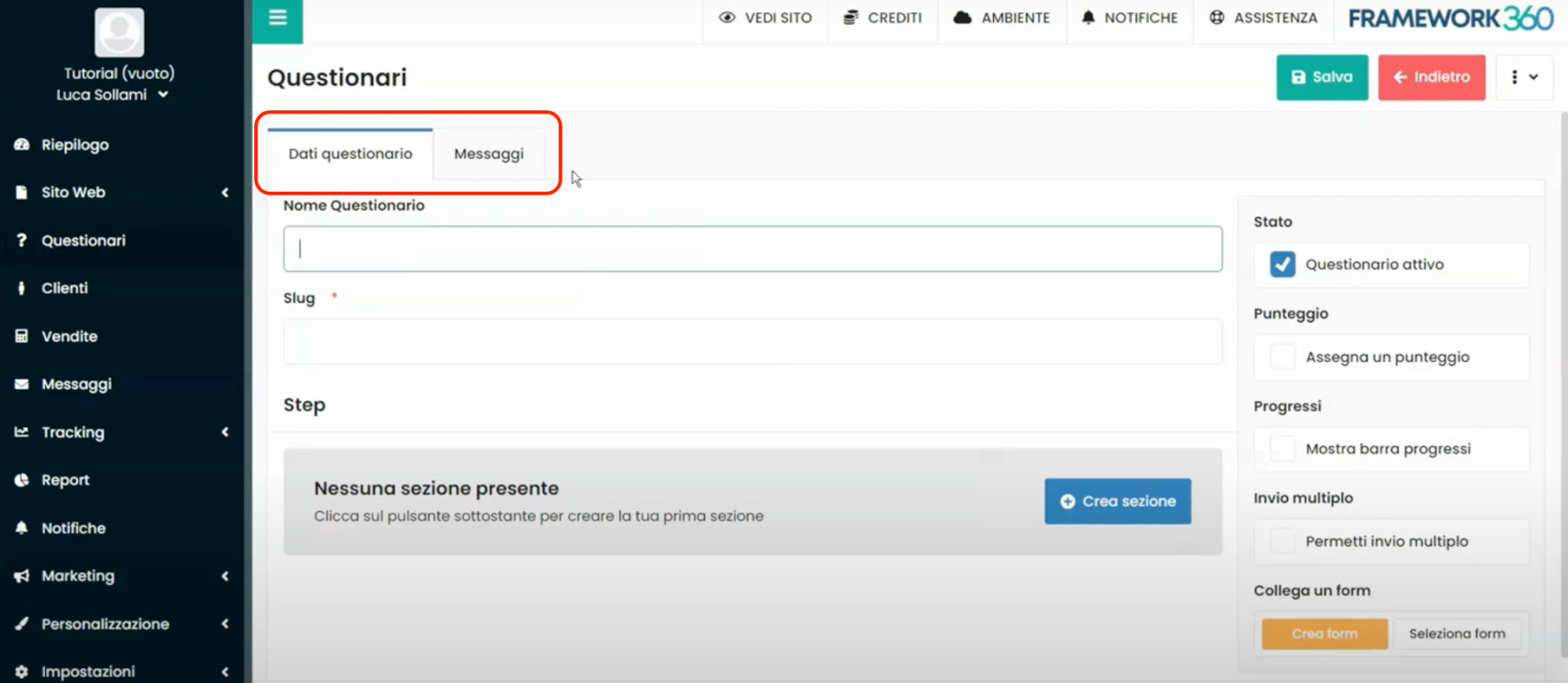 In the first tab, namely the tab “Questionnaire data”, we can enter all the main parameters of the questionnaire and the various steps that will compose it.