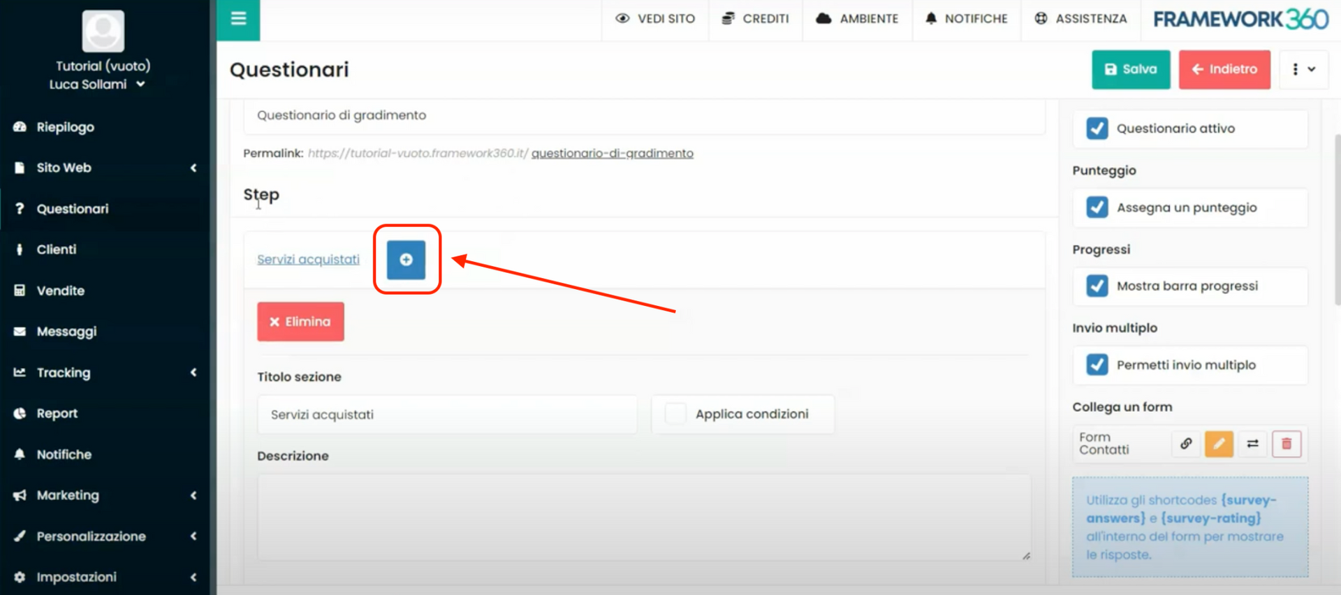 After setting the title and main parameters of our questionnaire, still within the "Questionnaire Data" tab of the questionnaire creation screen, in the central section called "Step” highlighted in the following figure, we can create all sections of the questionnaire.