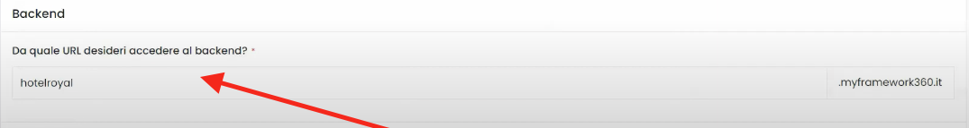 As for the Backend domain, which is the domain we will use to access our Framework360 environment, it will be formed by the name we intend to give to the site followed by .myframework360.it.