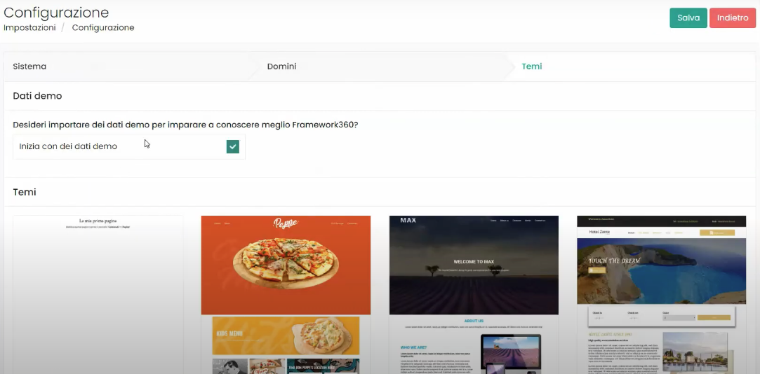 Regarding the configuration of the domain, that is, the address of our website, Framework360 provides us with a free subdomain, composed of the name we would like to give to our site followed by .framework360.it.