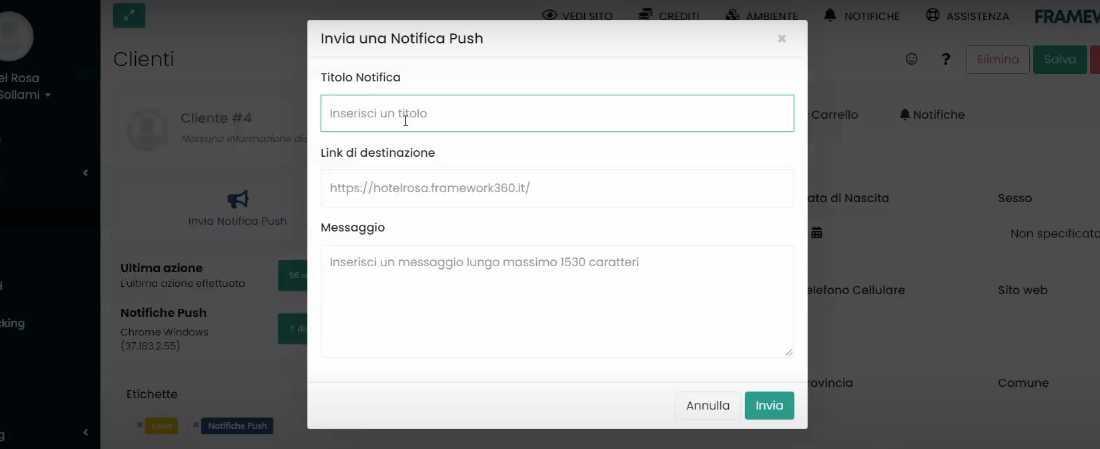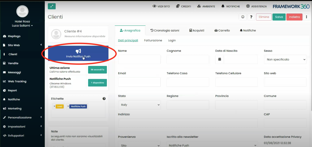 By going to the Customers area through the main menu of Framework360 within the customer database list, as we have seen previously, we will also find all the customers who have clicked on Allow the sending of push notifications when they have entered our website.