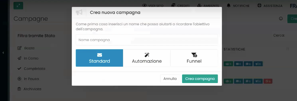 At this point, we will click on the top right button Create a new campaign and select what type of campaign to create: