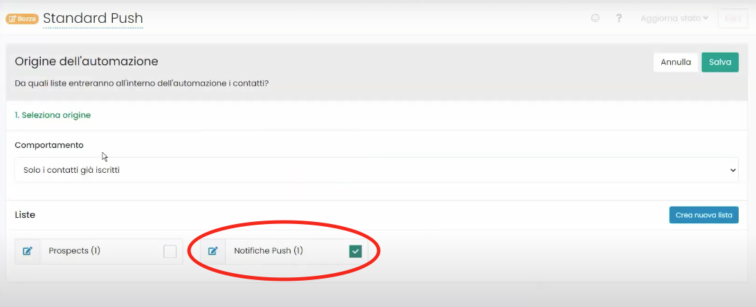 By selecting a standard campaign during creation, we can choose to send a push notification at our discretion to all those who have consented to receive push notifications. To do this in the campaign creation phase, we should first select as the recipient of the campaign the list called Push Notifications as shown in the figure: