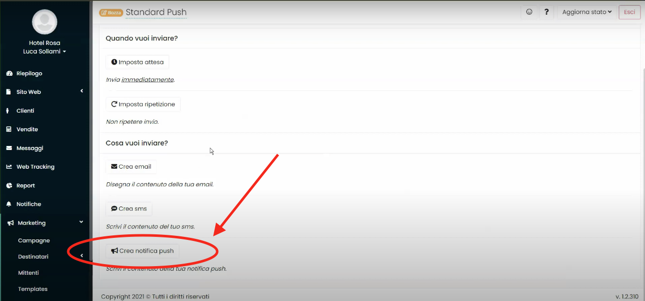Subsequently, once saved with the button at the top right Save, we could decide what to send with our campaign, at this point we will select the option Create push notification and go on to customize our notification similarly to what we saw in the previous step.