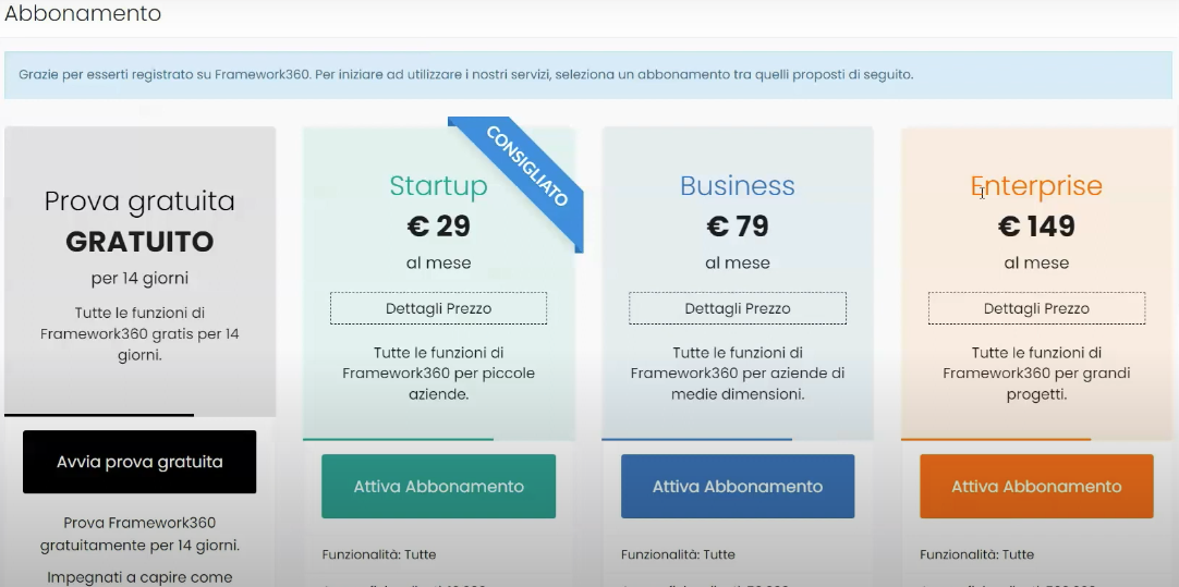 I should specify that all plans include all the functionalities of Framework360, with the difference being that in the more economical plans, resources are scaled back; to give an example, the number of client profiles in the Enterprise plan is 500,000, whereas in the Business plan it is 50,000 and, finally, in the Start-up plan it is 10,000.