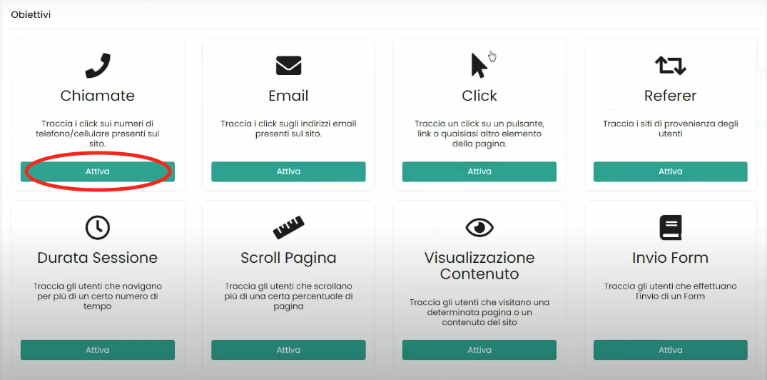 The goals tab gives us the ability to easily select the actions we want to enable on our website. In this guide, we will see how to enable the Calls action. Therefore, we will click on the Activate option next to the Calls action as indicated in the following figure:
